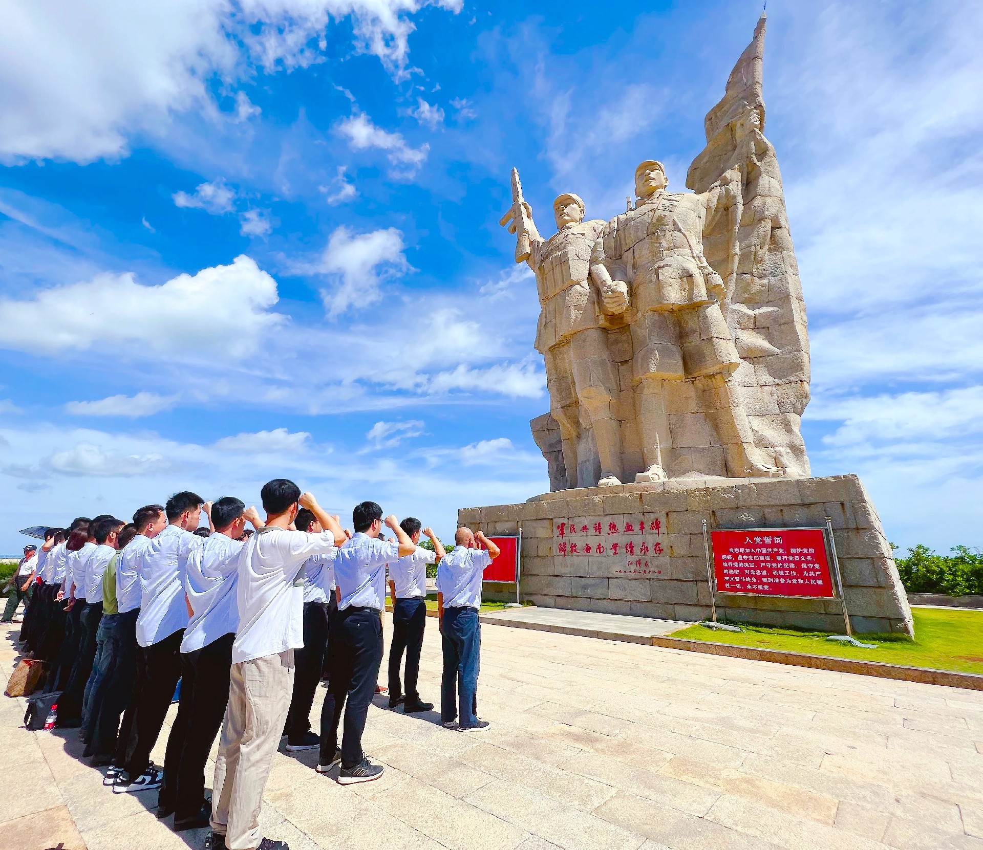 在臨高角解放海南紀念雕像前,全體人員面向豐碑雕像行三鞠躬禮并瞻仰,寄托對革命先烈的深切哀思,表達對革命先烈的無限崇敬之情。隨后,由公司黨委書記劉圳濱領誓,在場全體黨員、預備黨員高舉右拳,面對鮮紅黨旗,莊嚴宣誓,追憶入黨初心,一聲聲鏗鏘有力的誓言響徹現場,展現了大家愛黨敬黨的激情。